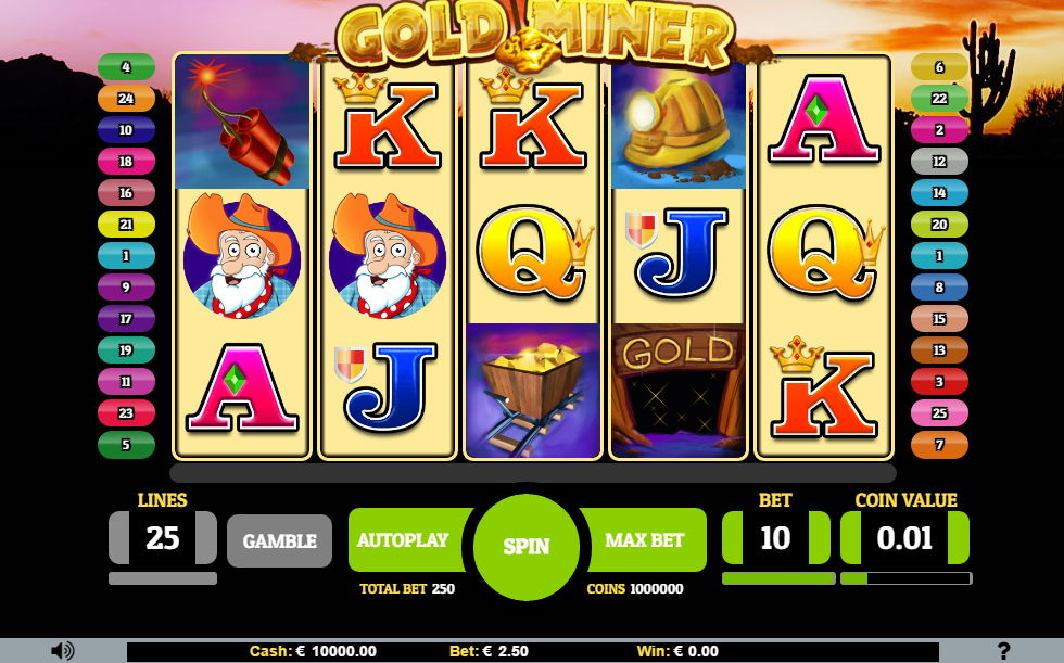 Gold Miner er en spilleautomat med fem hjul og 25 innsatslinjer. Du kan spille fra 25 cent til 50 € per spinn. Her virker det som om InstaCasino har gått for ”akkurat passe” på hele automaten, for å gi et alternativ som er så direkte med spilleren som det går an. Designet er basert på gullgraving: Du får se kortsymbolene vi kjenner så godt, samt gruvehjelm, gruvekjerre, inngangen til gruven, dynamitt og en munter gullgraver.