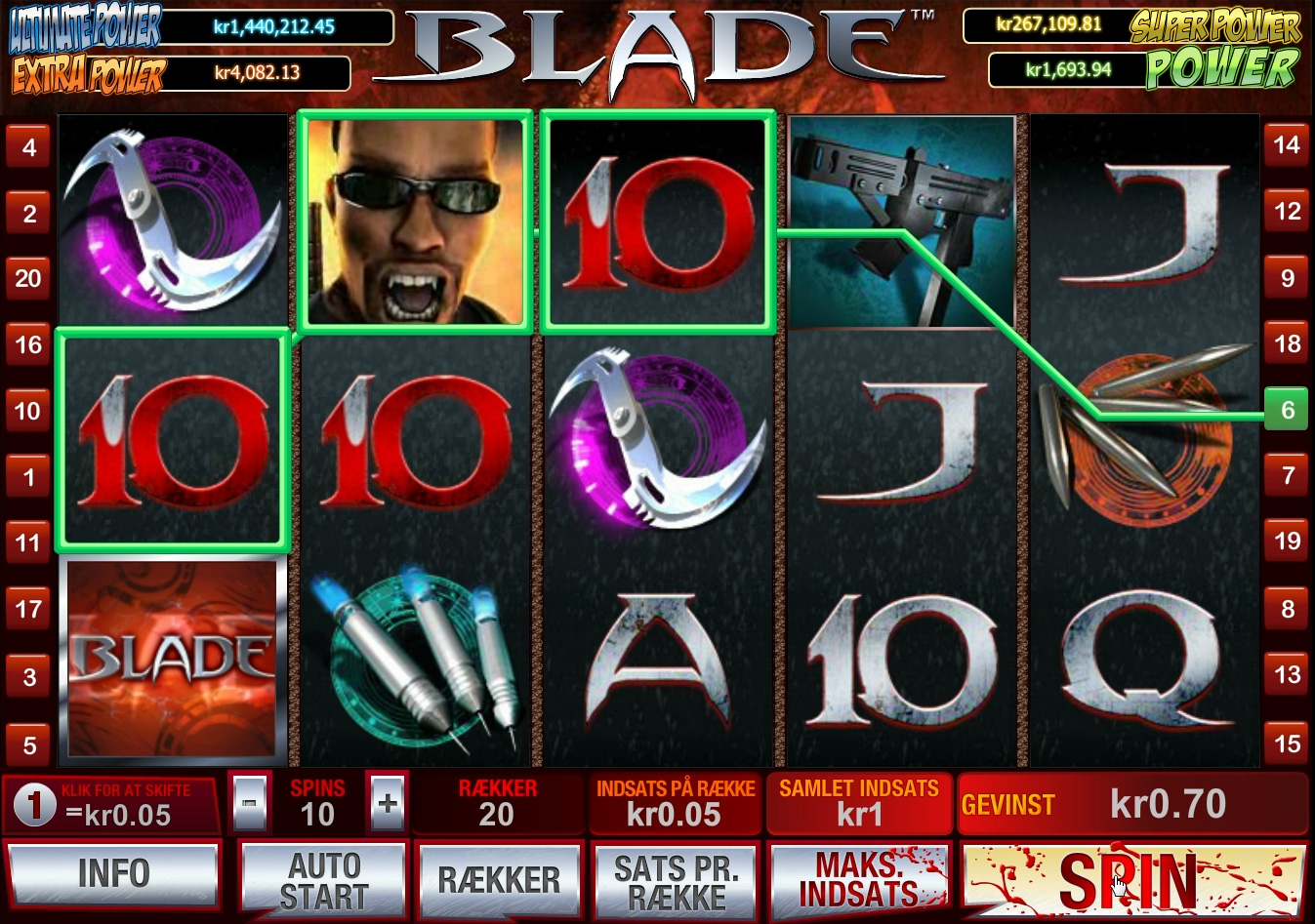 Alle som var over 12 år gamle på 90-tallet husker filmen Blade med Wesley Snipes i hovedrollen. Dette var en av de store blockbusterne i 1998, en film som millioner så på kino, og enda flere kjøpte videokassetten eller DVD-en. Det er dog mange som ikke vet at Blade opprinnelig er en tegneserie fra den velkjente tegneseriekongen Marvel Comics. Blade handler om en vampyrjeger som er halvt vampyr selv. Der vanlige vampyrer er redde for sollys, kan Blade trives både på dagen og natten. Vampyrjegeren bruker spesielt designede verktøy for å drepe de blodsugende beistene, og i filmen om Blade får vi virkelig se hvordan superhelten jobber. Filmen kom ut i 1998, og en oppfølger kom på plass i 2002. Deretter kom den tredje filmen i serien i 2004, og en hel TV-serie i 2006. Der tok det slutt, men Marvel lot spillutviklere kjøpe rettighetene til tegneseriene. Dette lot Playtech, en kjent spillutvikler med fokus på spilleautomater, skape en interaktiv versjon av Blade – som spillmaskin. Blade er en noe eldre spilleautomat, men for Marvel-fans er den helt perfekt. Blade var en mørk og mystisk kar, omringet av skygger og blod. Spilleautomaten har fått samme atmosfære – rødt og svart er de mest brukte fargene. Symbolene består av ulike detaljer fra tegneserien, samt kortsymbolene 10 til A i Blade-skrift. Innsatsmulighetene er veldig brede, i beste Playtech-stil. Her kan du velge hva hver mynt er verdt, hvor mange mynter du vil satse per gevinstlinje, og hvor mange linjer du vil aktivere. Maksimalt kan man komme opp i 200 dollar per spinn, men de fleste spillere holder seg på rundt ti-tyve kroner, altså et mye lavere nivå.