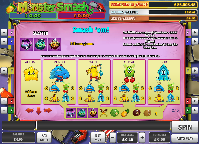 Noe som kanskje kan komme som en liten overraskelse, er at du ikke finner noen form for wildsymboler i Monster Smash. Men fortvil ikke, du finner to forskjellige scattersymboler som byr på nok av underholdning til å holde deg gående en god stund. Det første scattersymbolet er to balltrær med et plaster på. Hvor symbolene dukker opp på hjulene har mye å si for hva slags gevinster du får. Hvis scattersymbolet kommer i en bronse, sølv eller gullring, så blir spilleren kvalifisert til en av de store progressive jackpottene. Smakfull, Luksuriøs og Drømmesjanse heter de forskjellige jackpottene. Hvis du klarer å lande på tre gullruter med tre scattersymboler, så vinner du hovedpremien så lenge du spiller for minst 10 cent. Det er et annet scattersymbol som kalles «Here-We-Go», som sender spilleren til fem gratisspinn. Du kan få flere gratisspinn hvis du klarer å få flere scattersymboler under gratisspinnrunden. Grensen går til 100 runder eller 50 000 i gevinst.