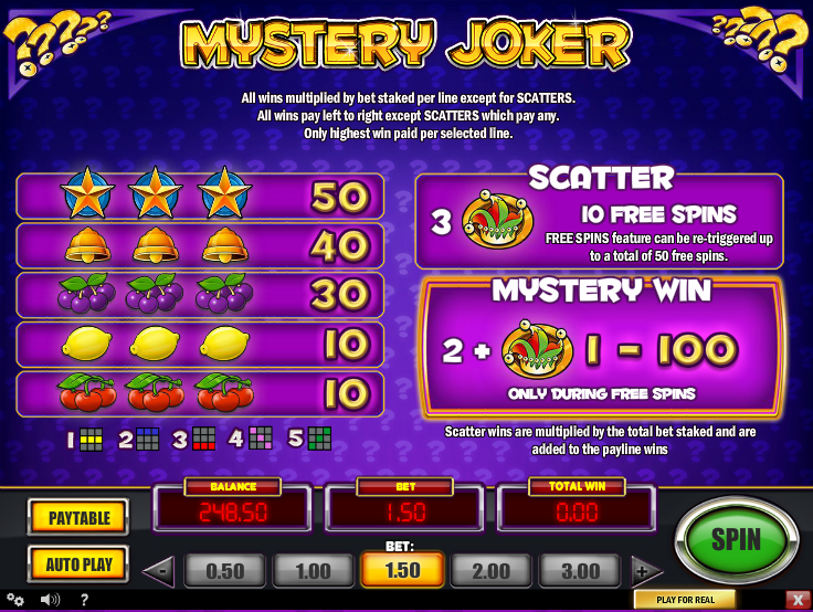 mystery-joker-infoSom en ikke så veldig standard spilleautomat, så har Mystery Joker noe færre spesialsymboler og spesialfunksjoner. Det er likevel et pluss at det finnes noe i det hele tatt, for det er ikke alltid noe slikt blir lagt til i en klassisk type spilleautomat. Mystery Joker er derimot en litt uvanlig spilleautomat, og dermed finnes det faktisk et spesialsymbol lagt inn, som da kan aktivere en ekstrafunksjon. Spesialsymbolet man finner er scattersymbolet. Scattersymbolet i Mystery Joker er i form av en jokerhatt, og det er dette symbolet som kan aktivere gratisspinnene i spilleautomaten. Hver eneste gang man får tre eller flere scattere på hjulene, vil man få tildelt 10 gratisspinn. Det som er fordelen med gratisspinnene er at de kan bli gjenaktivert flere ganger. Faktisk kan det skje opp til fem ganger i en spillerunde mens man spiller de første 10 rundene man fikk tildelt. Hvis man kun ender opp med å få to scattere på hjulene, så vil man likevel få tildelt en gevinst. Det følger nemlig med en funksjon som heter Mystery Win, og gjennom den kan man få en kontantgevinst på opp til 100 mynter.