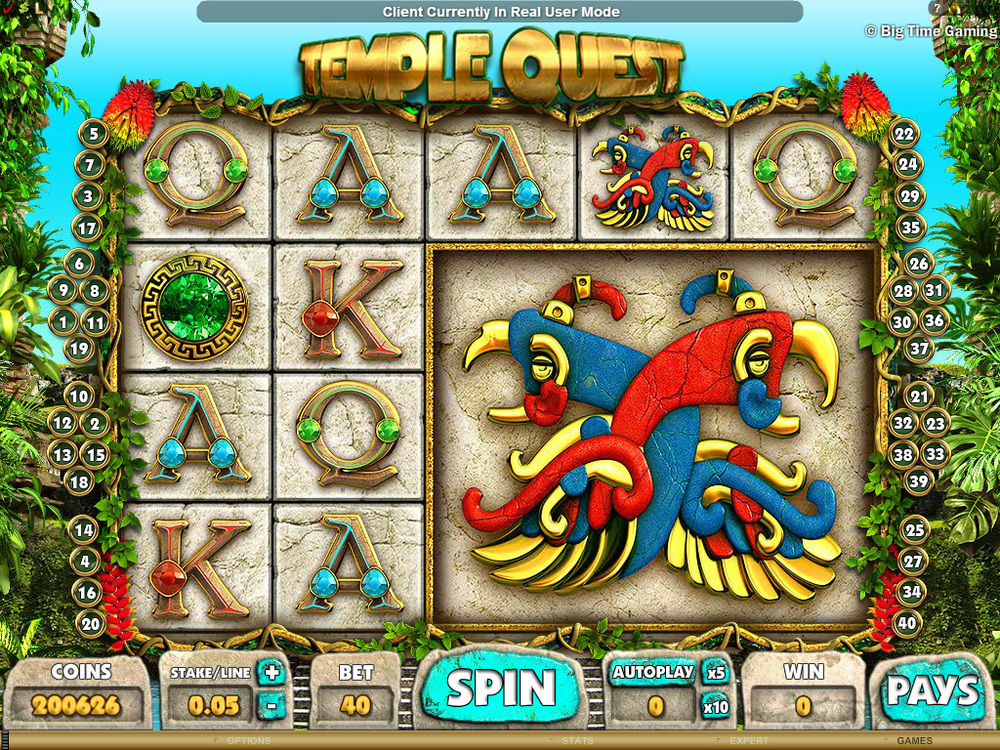 Temple Quest er en spilleautomat som er fullpakket med ting å glede seg til. Det er spilleverandøren Big Time Gaming som har utviklet spilleautomaten. De har tatt i bruk et populært tema, og gir spillerne et flott gjensyn med det. De har lagt inn mange gode bonuser, slik at spillerne har mye å se frem til, i tillegg til at man får sjansen til å bli tildelt enda flere gevinster. Spillet har også et enkelt oppsett, som kan brukes av alle slags spillere. Grafikken som er satt inn er også av topp kvalitet, og den er med på å skape den utrolig flotte spilleskjermen. Det er kun én ting som spilleren må gjennom før man kan begynne å spille, og det er å få satt en innsats.