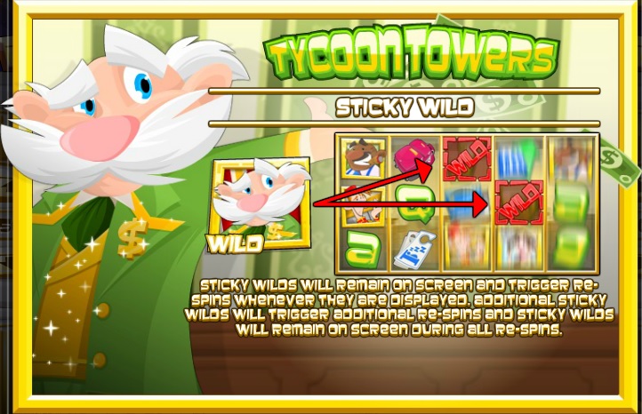 Tycoon Towers er en fin spilleautomat med morsomme symboler og stemningsskapende musikk. Spillet har ingen vanlige free spins, men man kan vinne re-spinn hver gang man får et jokersymbol. Da får man samtidig et fastlåst jokersymbol under respinnet, og hvis man får enda flere jokere, vinner man enda flere re-spinn, der alle jokersymboler blir låst fast. Selv om automaten verken har bonusspill, gambling eller andre ekstrainnslag, gjør re-spinnene at spillet blir både spennende og lønnsomt, særlig hvis man får mange jokere samtidig.