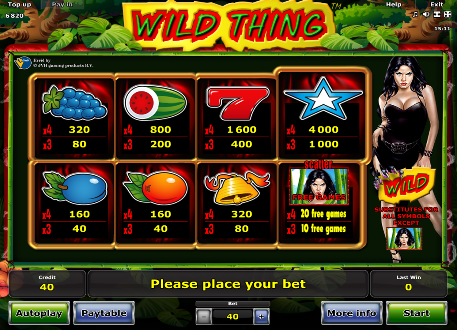 Før man faktisk kan sette i gang spilleautomaten og begynne å spille, så kan det være lurt å se litt på spilleskjermen. Det er veldig greit å se over hva slags oppsett man spiller med og også hva slags muligheter man har for å tilpasse innsatsen man skal spille med. I Wild Thing har man et oppsett som består av fire hjul og tre rader med symboler og totalt har man 10 innsatslinjer. Nederst på spilleskjermen vil man se at man har en justeringsknapp og det er denne spilleren skal bruke for å justere innsatsen i spilleautomaten. I Wild Things er innsatslinjene satt inn som faste, så spilleren kan ikke justere på dem. Det er også sånn at myntene i spilleautomaten er fastsatt på forhånd. Knappen som spilleren kan justere på er da en justering på hvor mye man skal satse totalt i en spillerunde. Man har en minusknapp og en plussknapp som da justerer innsatsen opp og ned. Innsatsen starter på 0,40 mynter. I Wild Thing kan man bruke autospinnknappen, som gjør at spilleautomaten går av seg selv et bestemt antall runder.